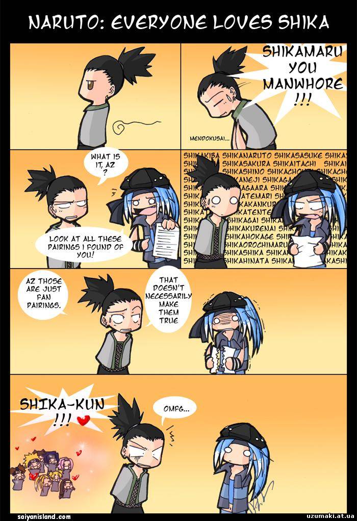 | Tikaryko, последняя: бедная Темари... Итачи рассказывает на ночь Саске сказку. Час рассказывает, второй, третий... Устал, решил отдохнуть. Тут Саске открывает глаза: - Нии-сан, а можно я теперь посплю? Ирука: - Сегодня мы будем изучать спряжение глаголов. Проспрягаем глагол "петь". Неджи, допустим, если ты поешь, то как ты скажешь? - Я пою. - Правильно. А если поет твоя сестра, то как скажешь? - Заткнись, пискля!