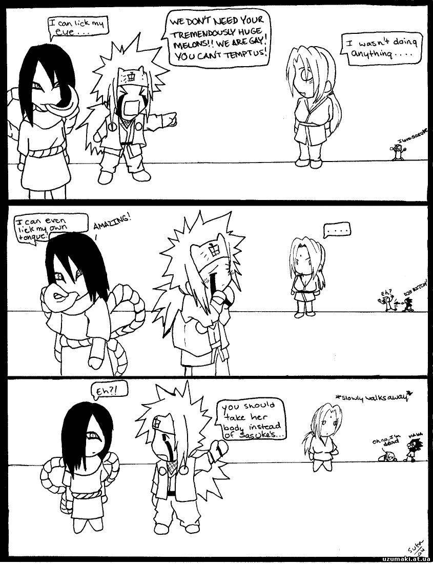 | Кёто, Класс!!! Ирука рассказывет детям сказку о Трех Поросятах: - И тогда Ниф-Ниф пришел в деревню и попросил у крестьянина немного соломы... Дети, как вы думаете, что сказал крестьянин нашему поросенку? Конохамару: - Я знаю! Он сказал - "Ух, ты! Говорящая свинья!" Невропатолог задает Орочимару вопросы: - Сколько у киски лапок? - Четыре. - Сколько у киски ушек? - Два. - А сколько у киски глазок? - Два. - А сколько у киски хвостиков? - Слышь, Кабуто, этот идиот, что, никогда не видел кошек?