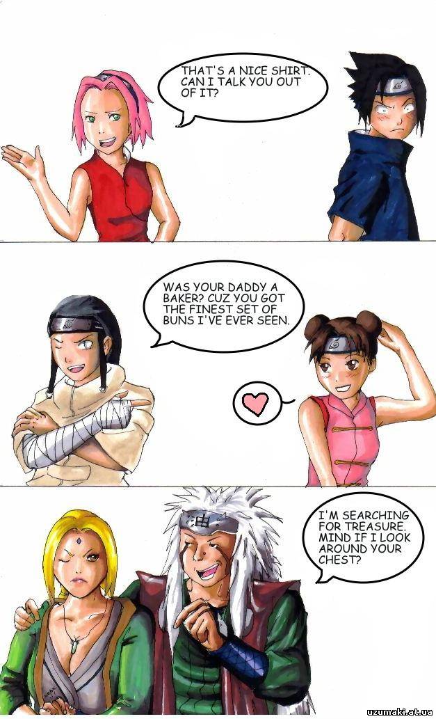 | - Кто на свете всех смелее, всех прекрасней и умнее? - Риторический вопрос, коль Чидори смотрит в нос... Слышит Третий Хокагэ стук в дверь. – Кто там? - Оротимару! - Ну и что? - Ну и ВСЕ!!! приходит маленький Оротимару домой и говорит: -Мама меня в школе педиком называют!!! -Ну набей им морды! -Не могу.. -А почему? -А они такие милые... выходят из бара пьяные цунадэ и дзирайя. цунадэ смотрит на небо и в полном недоумении говорит: - посмотри… две луны на небе… - ты что, совсем от выпивки окосела?! три!… - три?!… не может быть! о, смотри, оротимару идет. сейчас у него спросим! - орочимару, сколько лун на небе – две или три??? - а… в каком… ряду…? Какаши-сансей все таки скопировал СЕКСИ-НИНДЖИТСУ Наруто-куна.