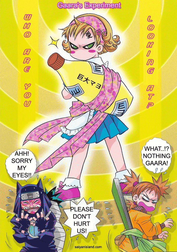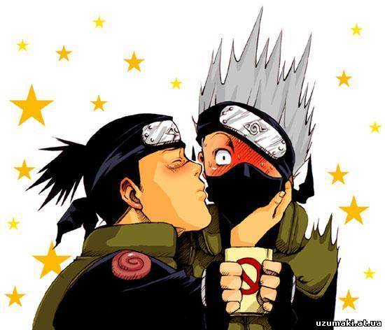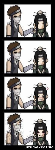 | Итачи проходит мимо полуразрушенного дома, и тут перед ним сверху падает кирпич... "Вот-те раз..."- подумал Итачи "Вот-те два!"- подумал Саске, бросая следующий кирпич... Судят Гая. Гай: Ваша честь, Цунаде-сама, я прошу заменить мне адвоката. Тот, которого мне назначили, совершенно не интересуется моим делом! Цунаде адвокату: Что вы на это скажете? Какаши: Простите, ваша честь, что вы сказали? Я прослушал ... Маленький Обито и Какаши О: Можешь понести мою сумку, я устал! К, делая свою фирменную физиономию: 500 баксов! О: А за красивые глаза? К, подумав: Ну лааадно, выковыривай! Какаши говорит Наруто:ты опять по Саске разенганом шибанул?! Наруто отвечает :я больше не буду! Какаши: а ему больше и не надо! P.S. если повтооряются то Гомэнасай.